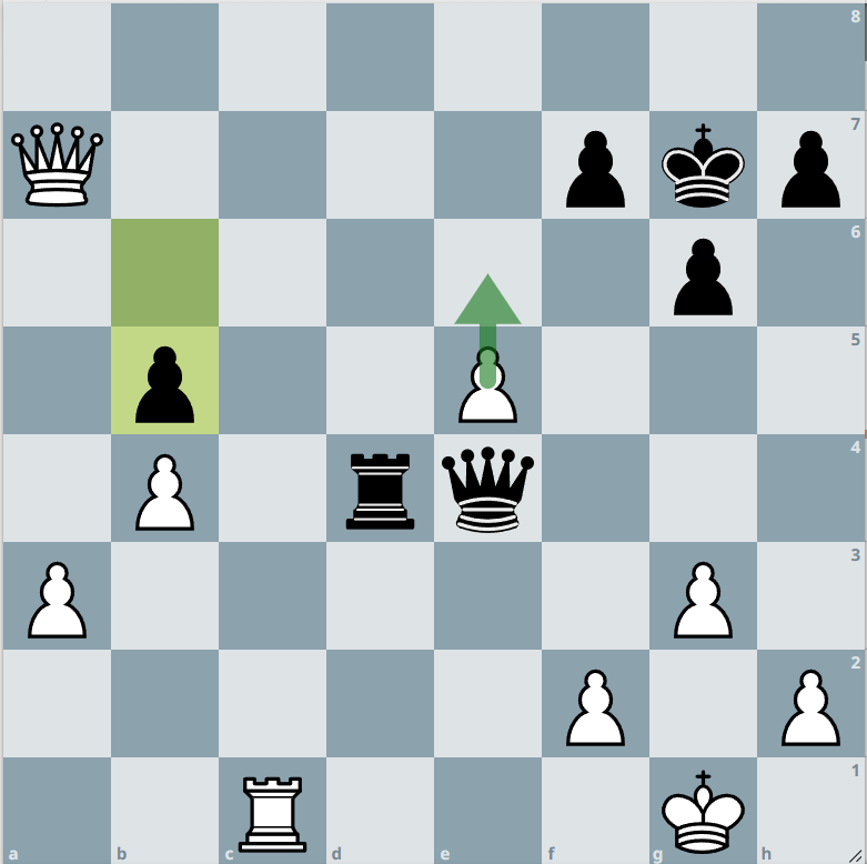 Bis hierhin hatte Migus Gegner sich noch mehr oder weniger gut gewehrt, aber er fand nicht die richtigen Momente, um wirklich auszugleichen. An dieser Stelle ist die Dame überlastet, weil sie sowohl den Vorstoß nach e6, als auch den Turm auf d4 decken muss. Migu spielte hier einfach 30. e6 und alle Messen waren gelesen, wenn er sich auch noch ein paar Züge lange wehrte. Das war Nach Kais Sieg unser zweiter früher Punkt.