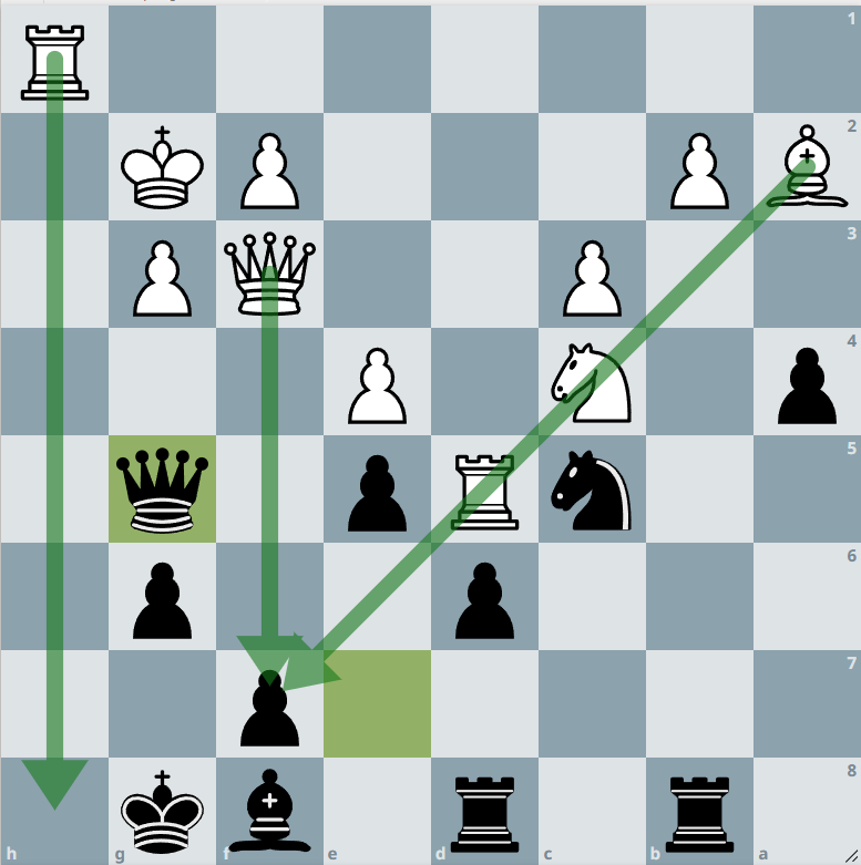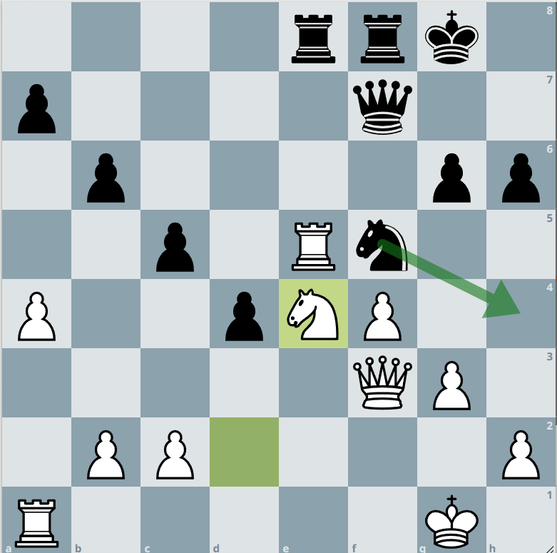 In der Partie geschah nach 27. Se4?? das starke 27. ... Sh4!! 28. De2 Sf3+ und die Fesselung auf der f-Linie schlägt voll durch. Dxf3 Txe5 ... und so schnell ist die Partie aus ...